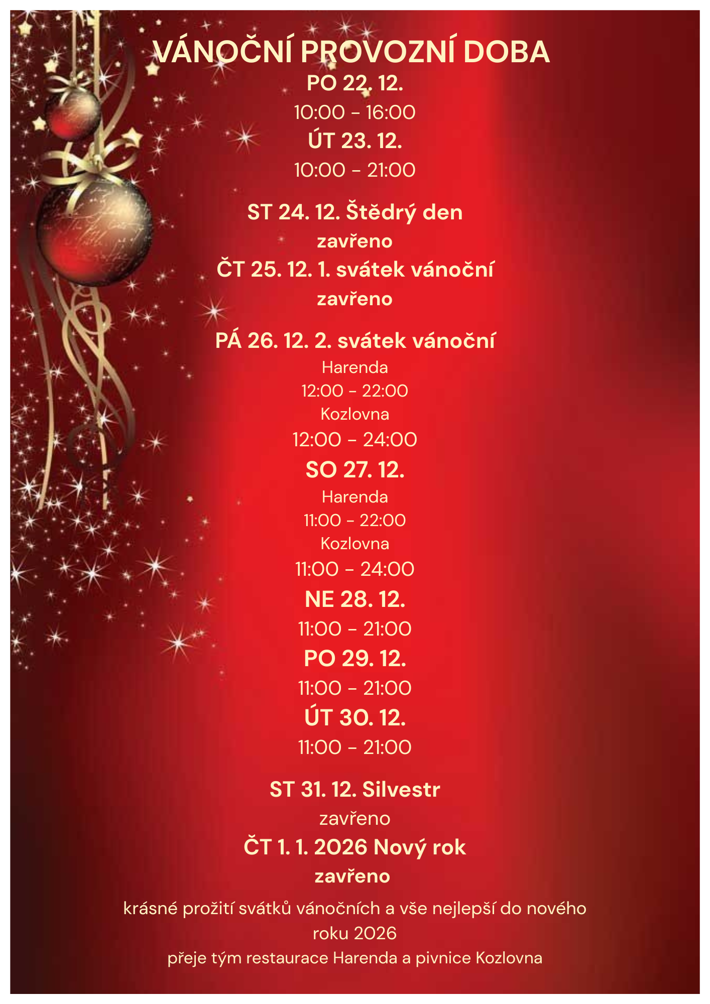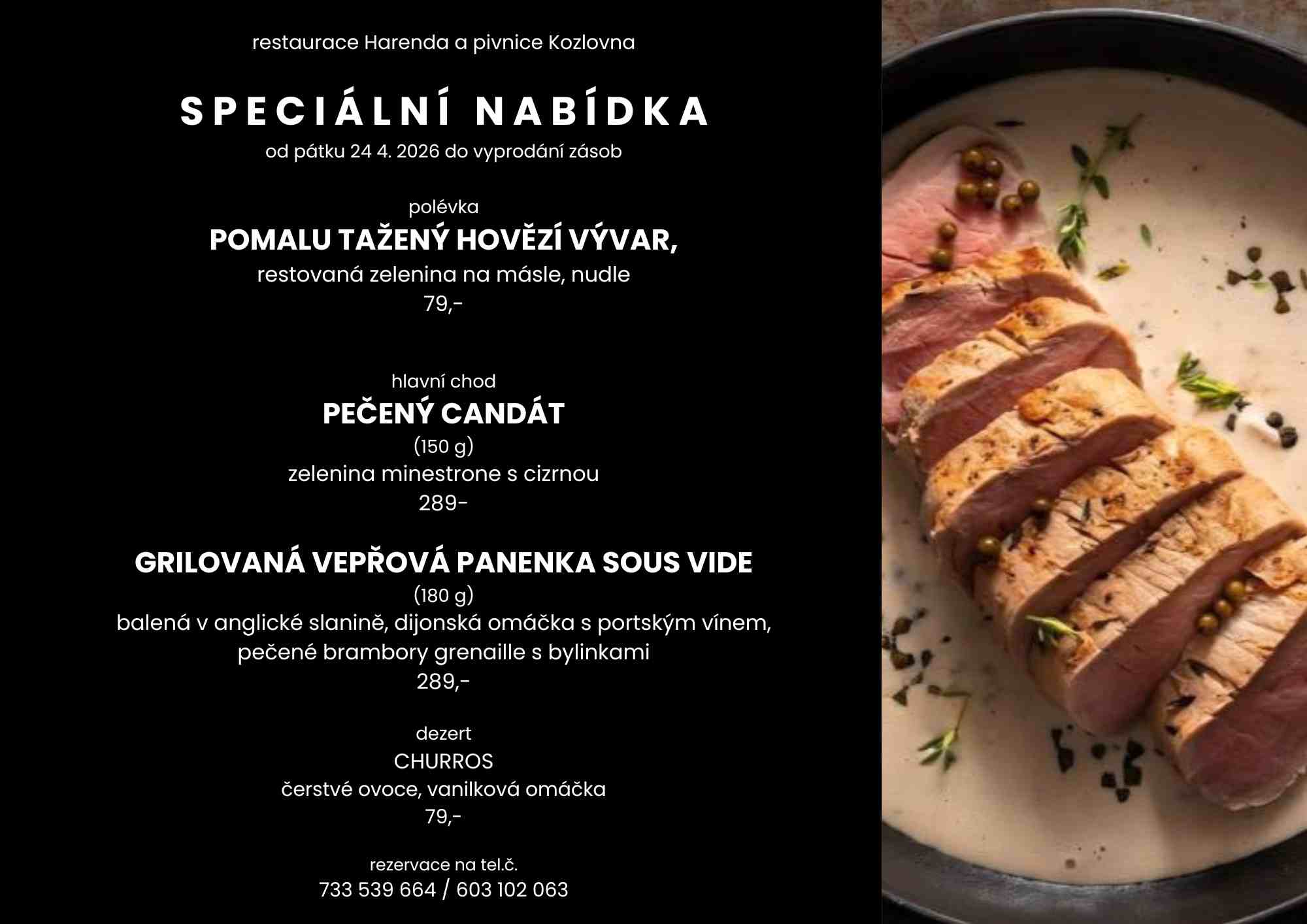 Dnešní Harenda je ovšem moderní restaurace, splňující trendy dnešní gastronomie. Naše kuchyně je zaměřena na čerstvé a sezónní suroviny s využitím moderních technologií tak, aby uspokojila ty nejnáročnější návštěvníky a to jak šíří nabídky, tak i kvalitou vydávaných pokrmů. Kromě perfektní kuchyně a profesionálního servisu se můžete těšit na tankové pivo Velkopopovický Kozel a širokou nabídku kvalitních vín od českých a moravských vinařů.